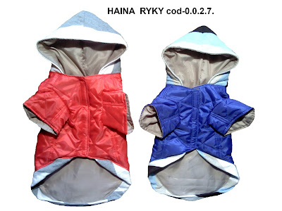 Haina RYKY cod-0.0.2.7.Este o haină creeată pentru anotimpul rece, zăpadă, frig. Este confecţionată dintr-un material impermeabil, este căptuşită cu vatelină srtatificată şi are dublură dintr-un material fin, lucios, alunecos. Se încheie pe piept cu un scai special, care nu agaţă blăniţa. Are diferite ornamente în culori de contrast, material din care este confecţionată şi gluga. Aceasta, pe timp nefavorabil, protejează şi asigură confortul termic. Este în aşa fel croită încât să permită libertatea de mişcare şi să fie foarte comodă, călduroasă, practică. Se confecţionează într-o gamă foarte variată de culori/combinaţii de culori şi pe toate mărimile (25-80).Moda pentru iarna acestui an sunt hăinuţele cu glugă, paspoalate cu blăniţă artificială sau tricot. Sunt aspectuoase, călduroase, în aşa fel croite încât să permită libertatea de mişcare, sunt căptuşite cu vatelină stratificată, iar ca dublură au diferite materiale călduroase. Se confecţionează într-o multitudine de modele şi materiale, şi o gamă foarte variată de culori precum şi pe toate mărimile (25-80)