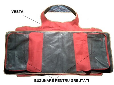 Vestuţa traning cod – 0.0.1.3., cu buzunare este o vestuţă specială pentru antrenamente, de dresaj. Este confecţionată dintr-un material foarte rezistent, frecvent impermeabil, este prevăzută cu buzunare pentru greutăţi(nisip)- pentru efectuarea exerciţiilor de dresaj corecte. Este căptuşită cu un material rezistent. Se încheie cu scai reglabil. Se confecţionează într-o gamă variată de culori şi pe toate mărimile. La cerere, buzunarele pot fi înlocuite cu diferite cârlige pentru a ataşa alte tipuri de greutăţi.