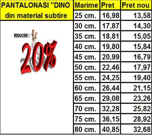 Reduceri 20 % Pantaloni DINO Sunt confectionati din materiale subtiri . Se incheie cu ajutorul unor inchizatori din plastic prinse la capatul unui elastic incat sa permita libertatea de miscare si sa nu creeze disconfort . Este ornat cu un buzunar aplicat, cu batistuta si brodat cu emblema firmei . Se poate purta ata de fetite cat si de baiet. Se confectioneaza pe 12 marimi (25 – 80 cm. ) dar la cerere se poate confectiona pe marimea dorita. Pentru amanunte ( marime, culoare, pret, livrare, etc. ) sunati la tel: 0721403635 – 0254515015. Vizitati: https://euroanimode.ro