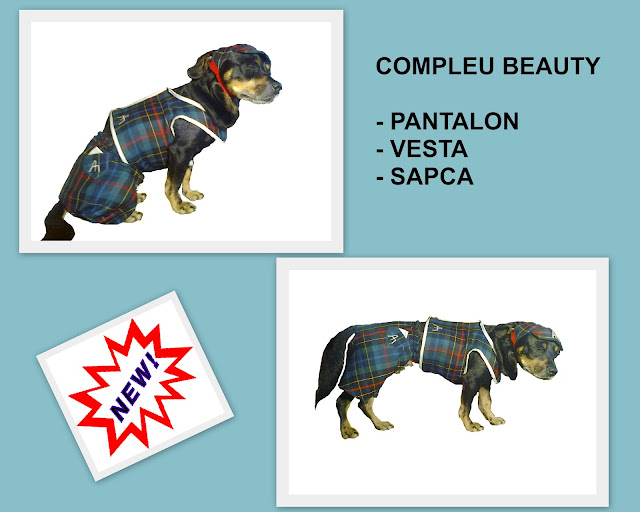 PRODUS CREAT LA SUGESTIA MEDICULUI VETERINAR ! Este format din vestuţă şi şepcuţă cu cozoroc. Vestuţa este confecţionată din material semiimpermeabil, este matlasată, este căptuşită cu un strat subţire de vatelină stratificată şi are dublură din polar sau alte materiale fine, călduroase. Este paspoalată, se încheie pe spate cu un scai special, care nu agaţă blăniţa. Oferă confort termic protejând organele vitale şi permiţând libertatea de mişcare. Şepcuţa cu cozoroc este confecţionată din material impermeabil, teflonat, se prinde sub bărbie cu un elastic fin, rezistent, care nu incomodează. Acest compleu este ideal pentru perioada de trecere dintre anotimpuri, când vremea este destul de instabilă. Se confecţionează intr-o gamă foarte variată de culori, pe toate marimile 25-80.