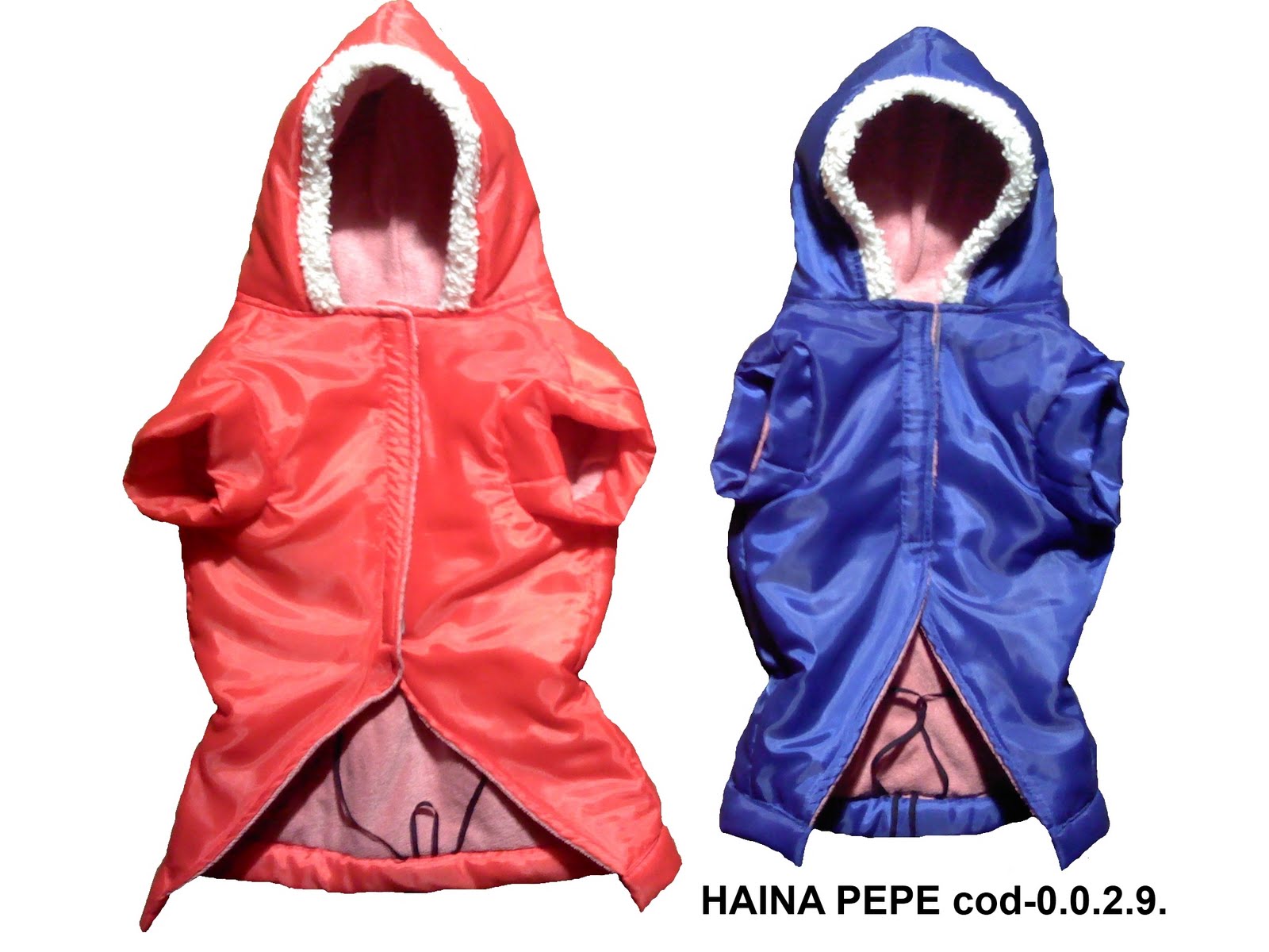 Haina PEPE cod- 0.0.2.9.Este o hăinuţă creeată pentru anotimpul rece, ploios sau cu lapoviţă şi ninsoare. Este confecţionată dintr-un material impermeabil, este căptuşită cu vatelină stratificată şi are dublură dintr-un material fin, moale, călduros. Se încheie pe piept cu ajutorul unui scai special, care nu agaţă blăniţa. Pentru a se fixa bine mai are un elastic subţire, dar rezistent, pentru picioruşele din spate şi codiţă. Are o glugă, care este ornată cu blăniţă artificială şi care se poate trage pe cap pentru a fi protejat în timpul vremii nefavorabile. Croiul este în aşa fel realizat încât să permită libertatea de mişcare, este foarte comodă, asigură confort termic şi se întreţine foarte uşor. Se confecţionează pe toate mărimile (25-80), într-o gamă foarte variată de culori.
